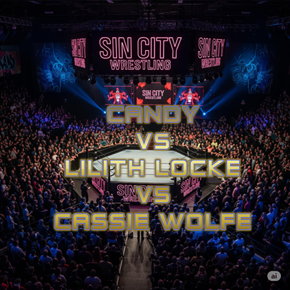 Lunam: And Belinda, if that wasn’t enough, we’ve got a Triple Threat match coming up that’s sure to be unpredictable from start to finish! On one side, the ever-energetic and bubbly Candy, who brings pure positivity and heart every time she steps into the ring. Then you add in the unstable and volatile Lilith Locke, a true loose cannon who can snap at any second. And finally, the eager-to-impress rising sensation Cassie Wolfe, who’s hungry to prove she belongs on this stage with the very best. Three wildly different personalities, three very different styles! It’s chaos in the making, and only one can come out on top!