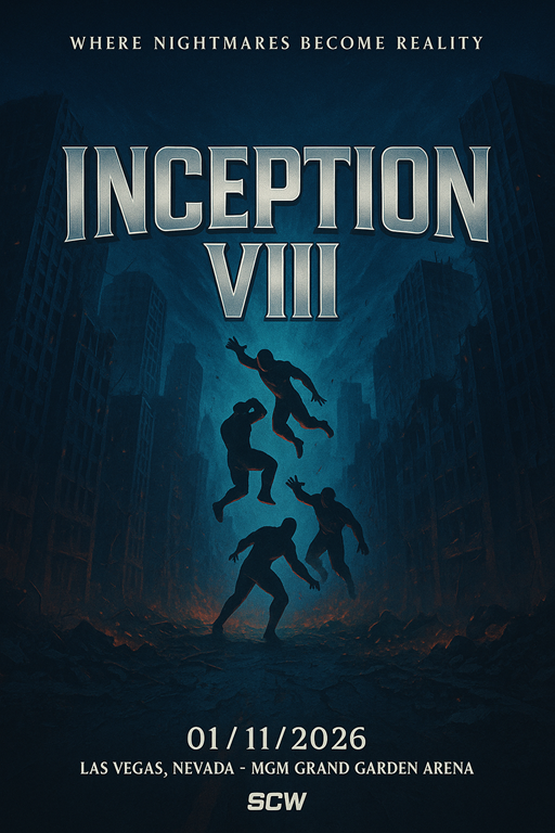Lights sweep over a sea of fans on their feet, the roar rising and falling like waves. The ramp and stage shimmer beneath LED boards pulsing with the SCW logo, the six-sided ring at the center lit like a jewel. Pyro cannons fire from the stage in a crackling burst, showering the air with sparks as the cameras glide across the crowd.