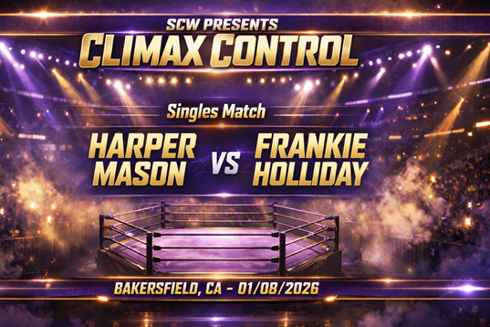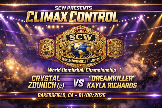 Simone: It all leads to tonight’s Main Event for the World Bombshell Championship, as Dreamkiller Kayla Richards finally gets the return match she has waited literal months for since losing the title to Frankie Holliday in 2025, and now she stands across from reigning champion Crystal Caldwell, who has officially been cleared for action after the vicious attack by Mercedes Vargas, making this a high-stakes collision between two elite competitors with everything to prove, because the result tonight will send major shockwaves straight into Blaze of Glory XV and could reshape the entire Bombshell title picture in one unforgettable fight. All this and more on SCW Climax Control!